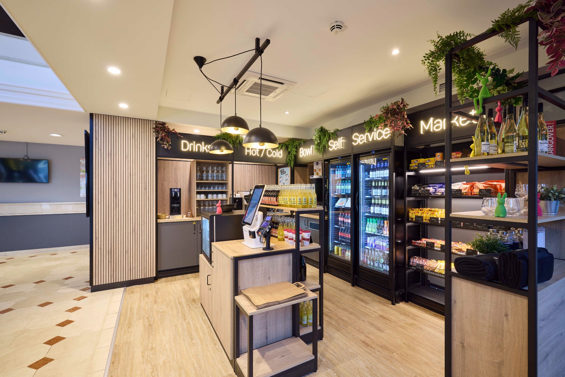 Hotel zřídil v lobby plně samoobslužný minimarket vybavený regály, lednicemi, kamerovým systémem a samoobslužnou pokladnou.